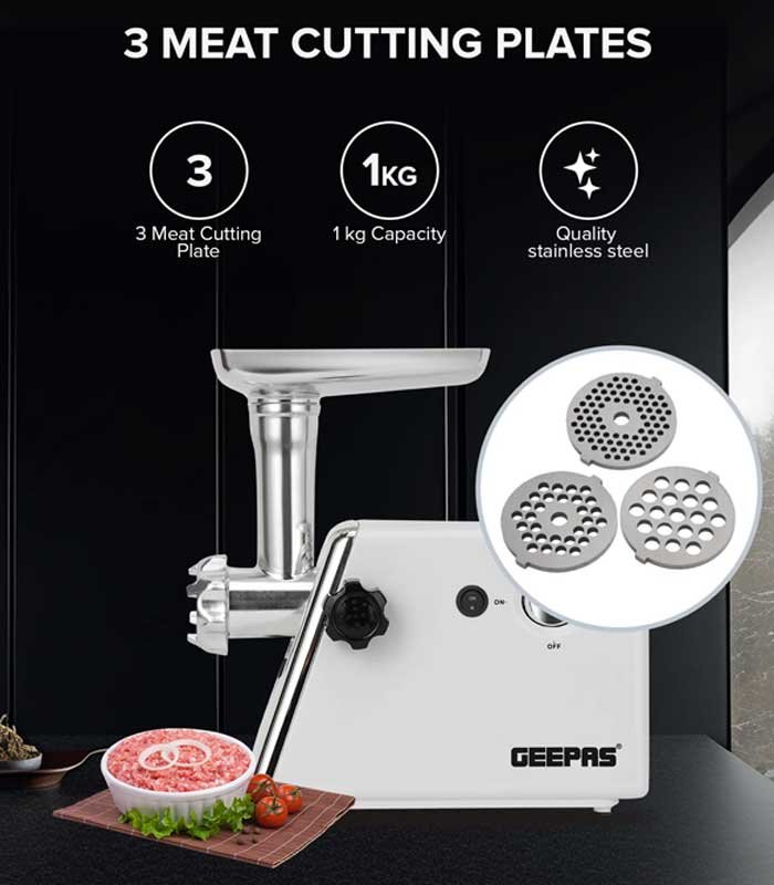 Overall, the Geepas Electric Meat Grinder – GMG746 is a dependable and practical solution for home meat preparation. With its efficient motor, user-friendly operation, easy maintenance, and compact design, it simplifies cooking while enhancing food quality and hygiene. Whether you are preparing everyday meals or special dishes, this electric meat grinder delivers reliable results and convenience in every use.