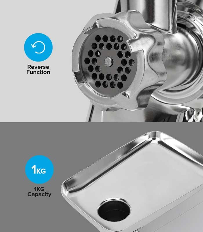 - CAPACITY 1KG/MIN – A large head volume allows you to make mince meat in just a few minutes. This opportunity will save your time. In just 1 minute you will have a ready kilo of minced meat with this electric grinder.