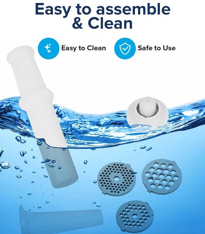- ACCESSORIES IN A SET – The kit of the meat mincer electric includes a sausage accessory, a kubbe accessory and a food pusher. This allows you to cook your homemade sausage and some stuff for it. In case the meat goes hard, you can use the food pusher.